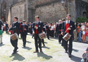Pareció en su momento lo más apropiado que fueran las gaitas las encargadas de hacer moverse a los Danzantes de San Lorenzo, aunque las opciones, como veremos, eran numerosas. Dicha decisión es perfectamente comprensible en una ciudad como Pamplona, donde la gaita ocupa un lugar eminente (pero no siempre privilegiado). El timbre y volumen del instrumento lo hacen apropiado para la danza en espacios abiertos, más aún en esta época en la que sonidos y músicas producidas por maquinaria pesada sustituyen y dominan a los músicos de carne y hueso. La propia banda de gaiteros es una agrupación apta para este tipo de danza, puesto que no es excesivamente numerosa, pero cuenta con una base rítmica, el tambor, y un componente melódico, la gaita, que a su vez se subdivide en dos voces, proporcionando una mayor riqueza sonora. |