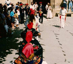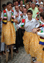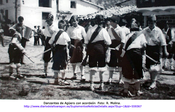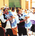 No obstante, es bien sabido que en épocas de sequía gaiteril (por falta de músicos o presupuesto) y hasta hace no más de veinte años, en muchas localidades el acordeón el clarinete u otro instrumento ha sido el encargado de hacer bailar a los danzantes. Después han venido tiempos mejores y la soledad de dicho músico al que por supuesto alabamos su habilidad y funcionalidad, se ha visto sustituida por agrupaciones musicales más complejas. Hemos mencionado la banda de gaiteros, pero en lugares como Gallur, Huesca o Almudévar entre otros muchos, es la banda de música del pueblo la encargada de poner la música. Esto, claro está, amplía enormemente las posibilidades musicales, pero carece de sentido fuera de la fiesta en el propio pueblo, puesto que por razones lógicas, resulta costoso en todos los sentidos llevar una banda completa a cada lugar donde los danzantes sean requeridos. |