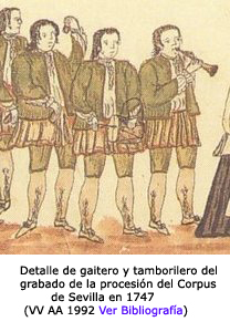 También históricamente ha existido esa ligadura, como demuestra el grabado del Corpus de Sevilla de 1747. Jesús Ramos nos dice: “la gaita [para] el acompañamiento de las danzas (...) se hace regular en los grupos venidos a Iruña entrado el siglo XVII” (Aramburu et al., 1999: 481. Ver Bibliografía). Es más, propone una cronología en la que afirma que la gaita sustituyó en Pamplona al txuntxunero a partir de mediados del siglo XVII, cuando empieza a hacer su aparición junto con grupos de danzantes venidos del sur de Navarra. A principios del siglo XVIII se acompaña de tambor. En el caso de la gaita, no resulta siempre fácil discernir en la documentación antigua si se trata de gaitas de odre o gaitas simples. |