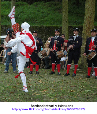Por lo tanto, la flauta de tres agujeros con un instrumento de percusión (sea tamboril o tambor de cuerdas) y normalmente un músico solo, han acompañado y acompañan todavía hoy a las danzas en ambas vertientes pirenaicas de este a oeste (Yebra de Basa, Embún, Oñati, Tolosa etc.) e incluso fuera de Navarra, en zonas de clima mediterráneo, como Puebla de Guzmán en Huelva. |