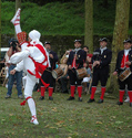 También en Pamplona encontramos referencias de su presencia como acompañante de danzantes (Aramburu et al., 1999: 484, 540), pero no parece que haya sido nunca simultáneamente con instrumentos de doble lengüeta como es la gaita. Por los motivos antes descritos, nos decantamos por la doble lengüeta para acompañar a los danzantes de San Lorenzo, reconociendo, eso sí, plena legitimidad para dicha labor a la flauta de tres agujeros. |