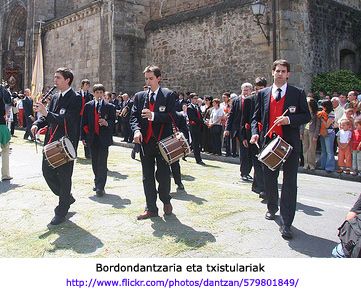 Beraz, hiru zuloko flautak perkusiozko musika tresna batekin (danbolina edo ttunttuna izan) eta musikari bakarrak normalean, dantzak lagundu izan ditu eta laguntzen ditu oraindik Pirinioen bi isurialdeetan ekialdetik mendebaldera (Yebra de Basa, Embún, Oñati, Tolosa etab.). Nafarroatik kanpo ere hala da, mediterraniar klimako eremuetan Puebla de Guzmánen ( Huelva) kasu. |