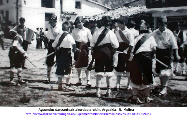 Dena dela, aski gauza jakina da gaitero eskasia zegoen garaian (musikari edo aurrekontu faltagatik) eta ez duela hogei urte baino gehiago arte, leku askotan akordeoiak, klarineteak edo bestek izan duela danzanteak dantza arazteko ardura. Gerora garai hobeak etorri dira eta musikari horren bakardadea, zeinaren abilezia eta funtzionalitatea miresten dugun, konplexutasun handiagoko talde musikalek ordezkatu dute. Gaitero banda aipatu dugu, baina Gallur, Huesca edo Almudévar bezalako lekuetan beste askoren artean, herriko musika banda da musika jartzearen arduraduna. Horrek jakina, aukera musikalak erruz zabaltzen ditu, baina ez du zentzurik herrian bertako jaietatik kanpo, zentzu guztietan kostu handikoa baita banda oso bat danzanteek emanaldia eskaini behar duten tokira eramatea. |