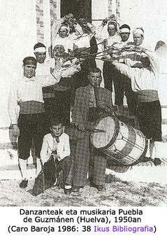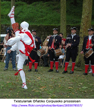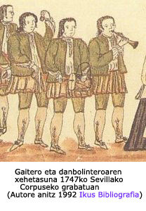 Historian zehar ere lotura hori egon da, 1747ko Sevillako Corpuseko grabatuak frogatzen duen gisan. Jesus Ramosek diosku: “gaita dantzen lagungarri erregular bilakatu zen Iruñera etorritako taldeetan XVII. mendean sartuta” (Fernández de Larrinoa, 1999: 481. Ikus Bibliografia Itzulpena gurea). Are gehiago, kronologia bat proposatzen du, zeinean XVII. mende erditik aurrera gaitak txuntxuneroa ordezkatuko zuen Iruñean, Nafarroako hegoaldetik etorritako danzante taldeekin batera agertzen hasten den unean hain zuzen. XVIII. mende hasieran danborra du lagun. Gaitaren kasuan, ez da beti erraza dokumentazio zaharrean zahagi gaitez edo gaita soilez ari diren jakitea. |